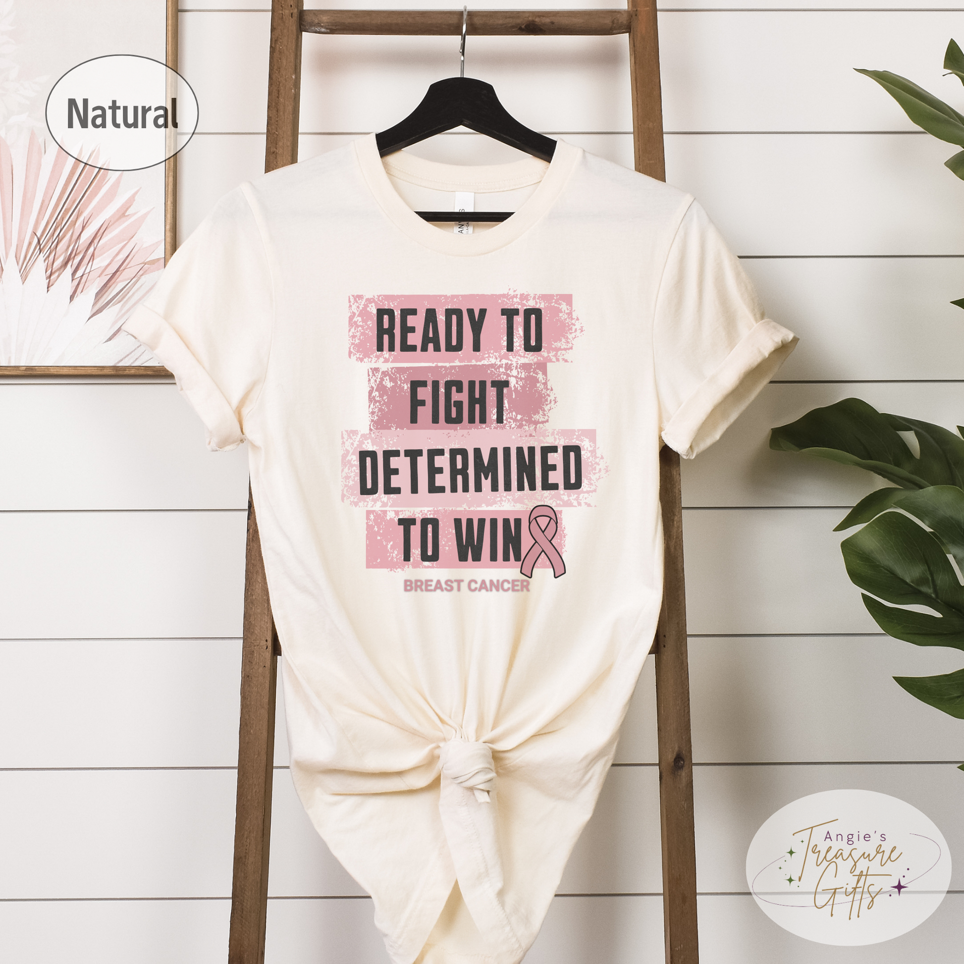 Featuring the bold phrase "Ready to Fight – Determined to Win" in distressed pink color block style, this inspirational tee is perfect for warriors, survivors, and supporters alike. The design is printed on a premium Bella Canvas 3001 unisex t-shirt, known for its light weight, super-soft feel, flattering fit, and long-lasting quality.