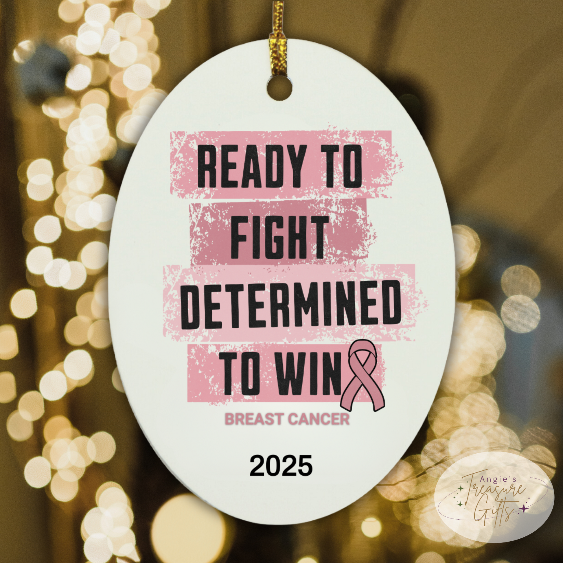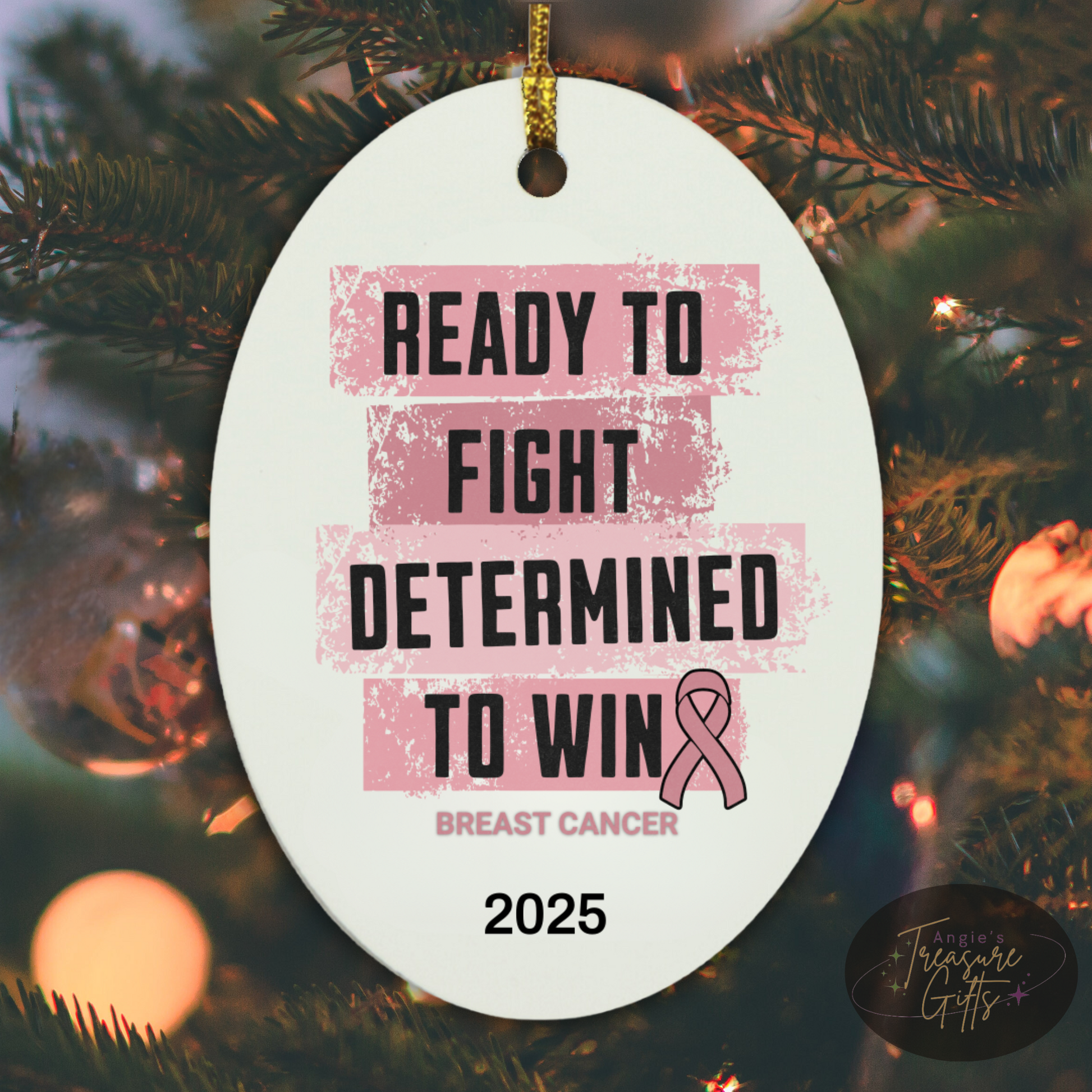 Personalized Breast Cancer Awareness Ornament – “Ready to Fight, Determined to Win” Pink Ribbon