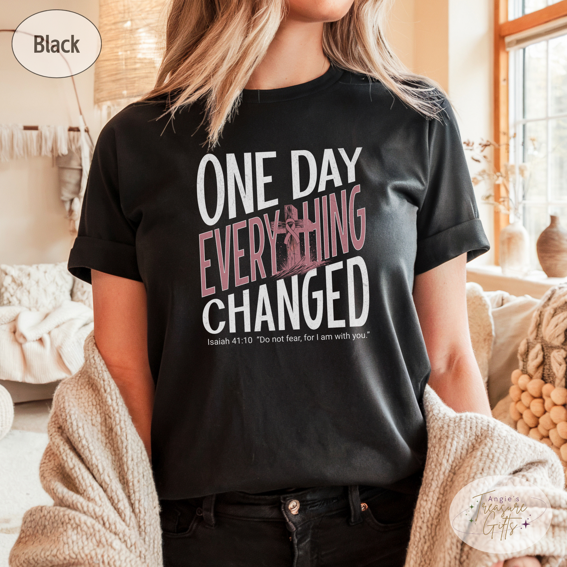 One Day Everything Changed Isaiah 41:10 Breast Cancer Awareness Shirt | Pink Ribbon Faith Hope Love Bella Canvas 3001 Tee