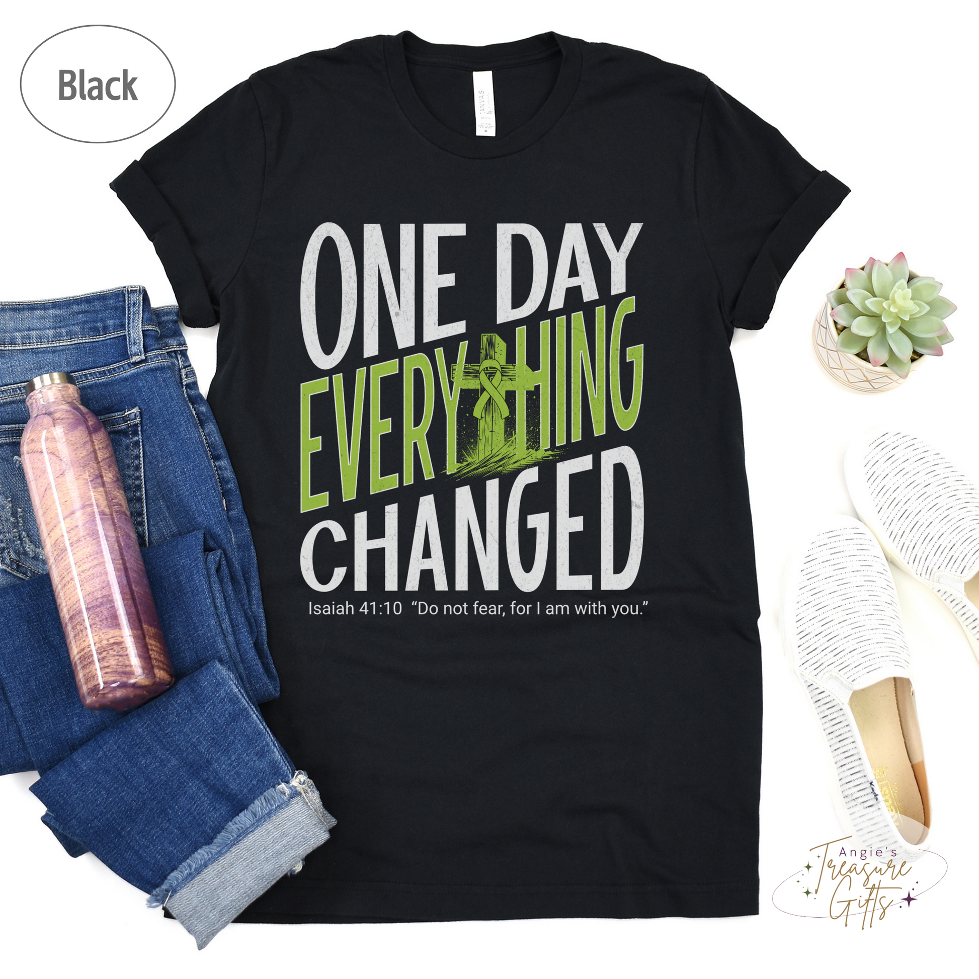 One Day Everything Changed Isaiah 41:10 Non-Hodgkin’s Lymphoma Awareness Shirt | Lime Green Ribbon Faith Hope Love Bella Canvas 3001 Tee