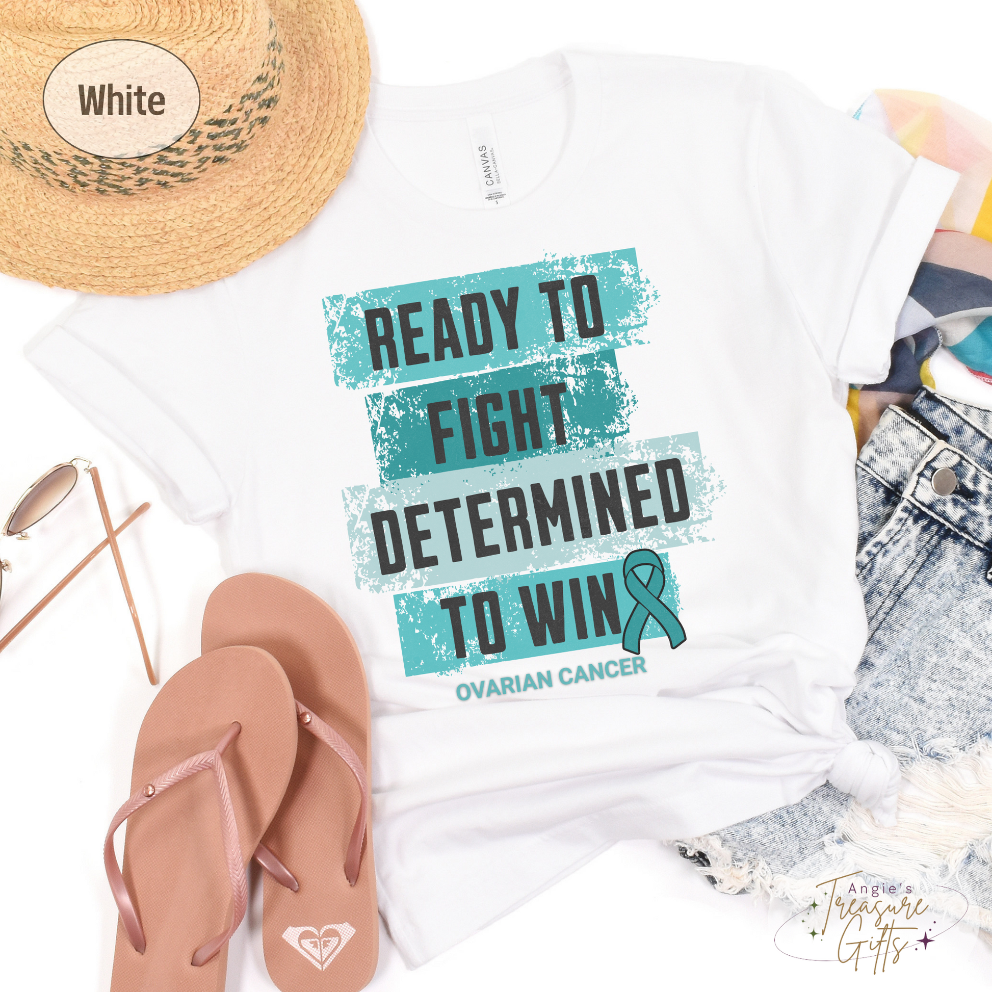 This empowering design features the words "Ready to Fight – Determined to Win" set in a distressed teal block style—symbolizing courage, resilience, and hope. Printed on the ultra-soft Bella Canvas 3001 unisex shirt, it’s perfect for ovarian cancer warriors, survivors, and supporters.