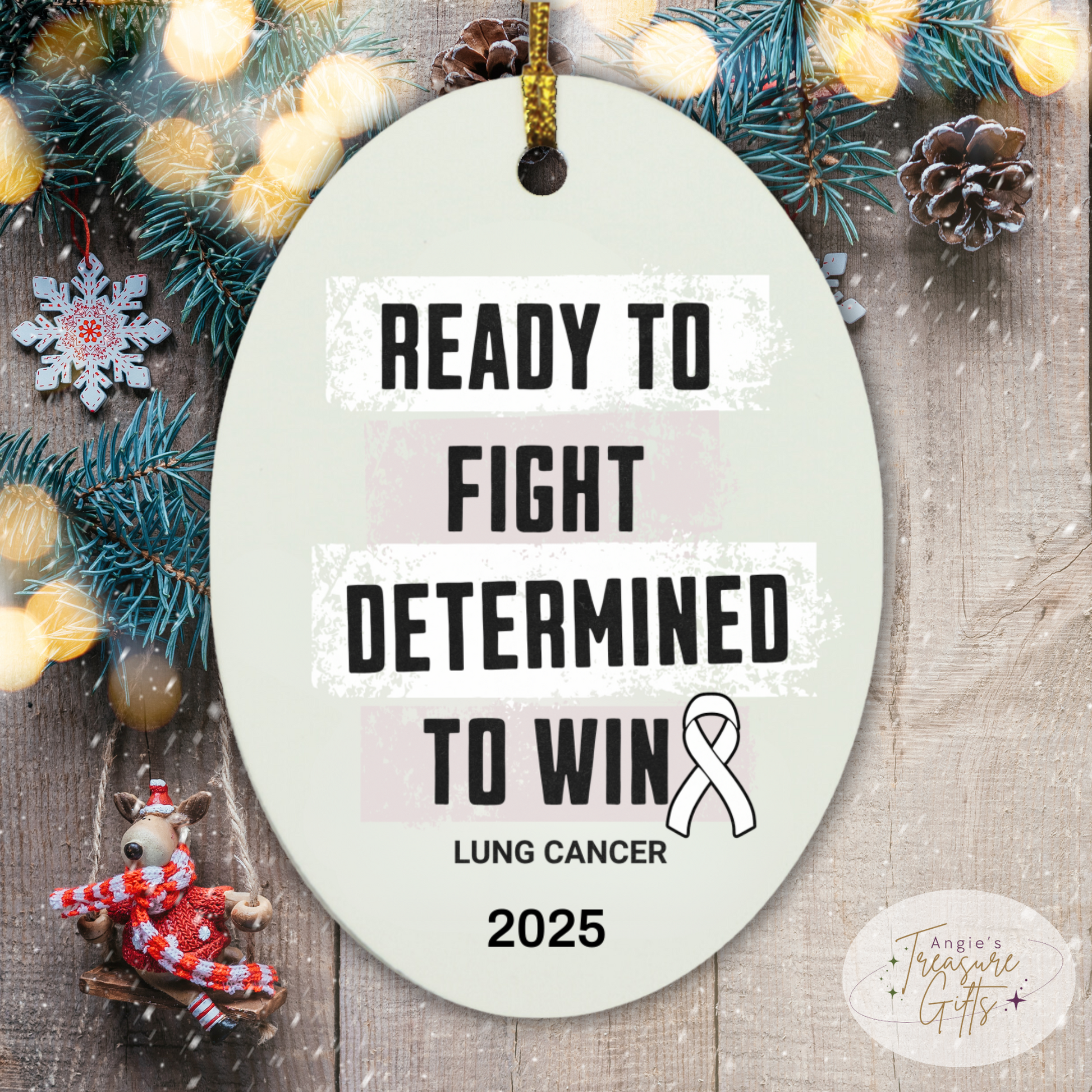 Show hope and resilience with our lung cancer awareness ornaments, featuring a white ribbon and “Ready to Fight, Determined to Win.” Personalize with the year to celebrate survivorship or milestones.