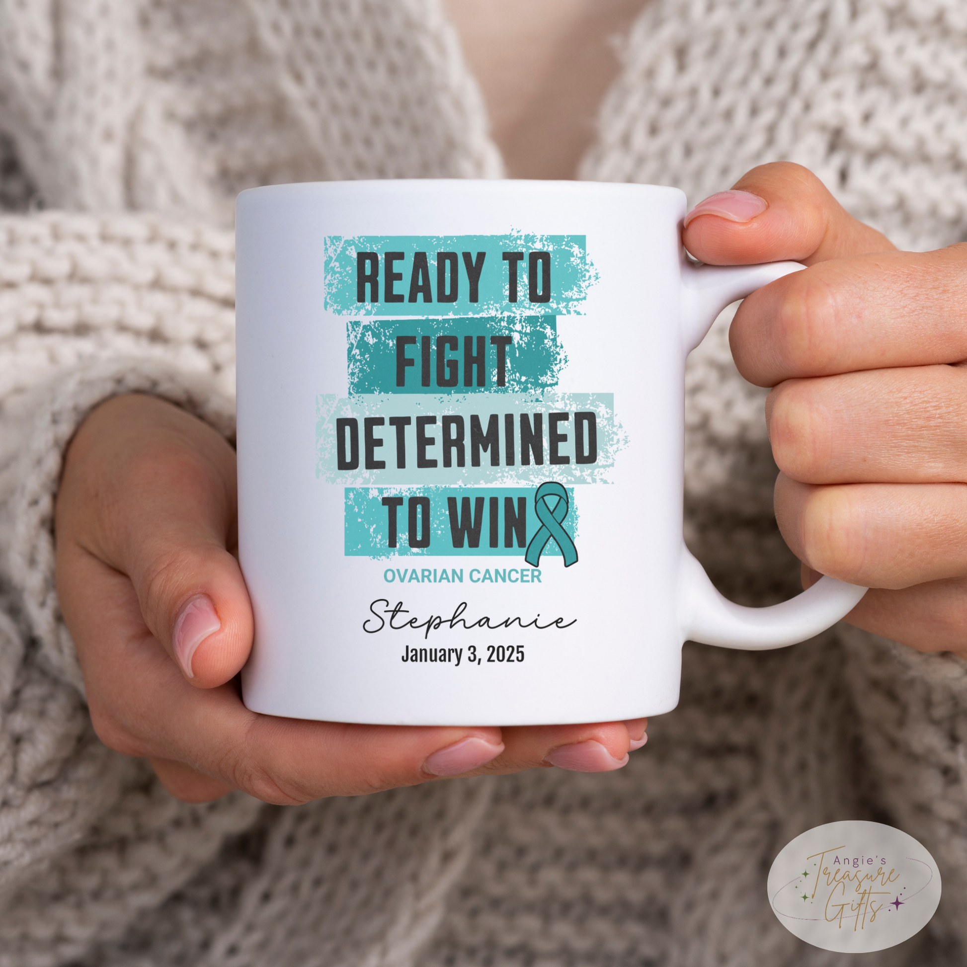 Personalized Ovarian Cancer Awareness Mug – “Ready to Fight, Determined to Win” – Teal Ribbon Survivor Gift