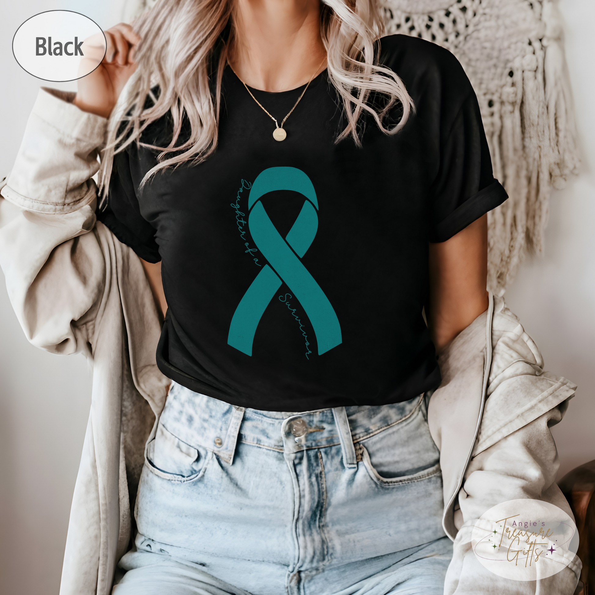 Personalized Ovarian Cancer Awareness Shirt – Teal Ribbon Tee – Customizable Survivor, Warrior, Fighter Support – Bella Canvas 3001
