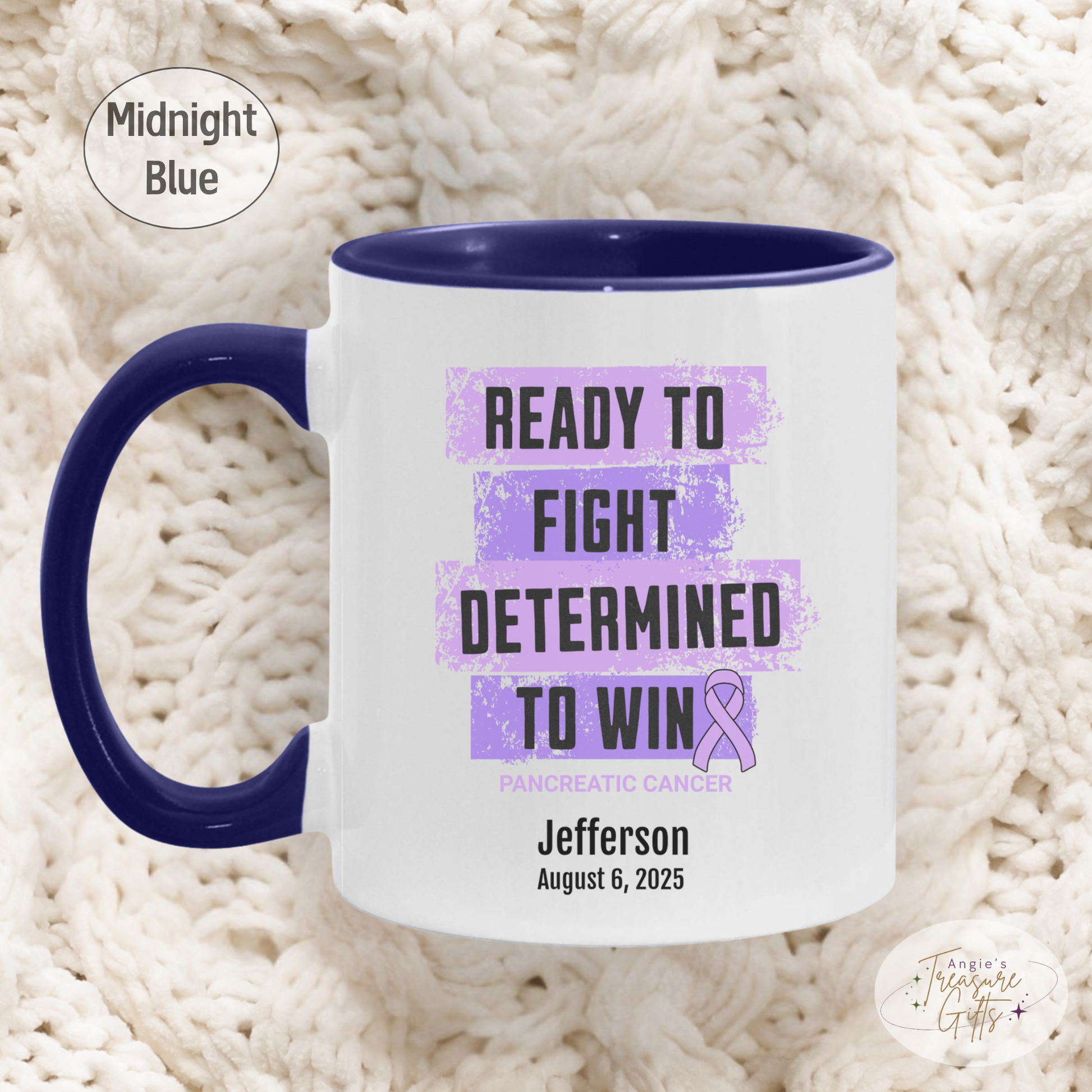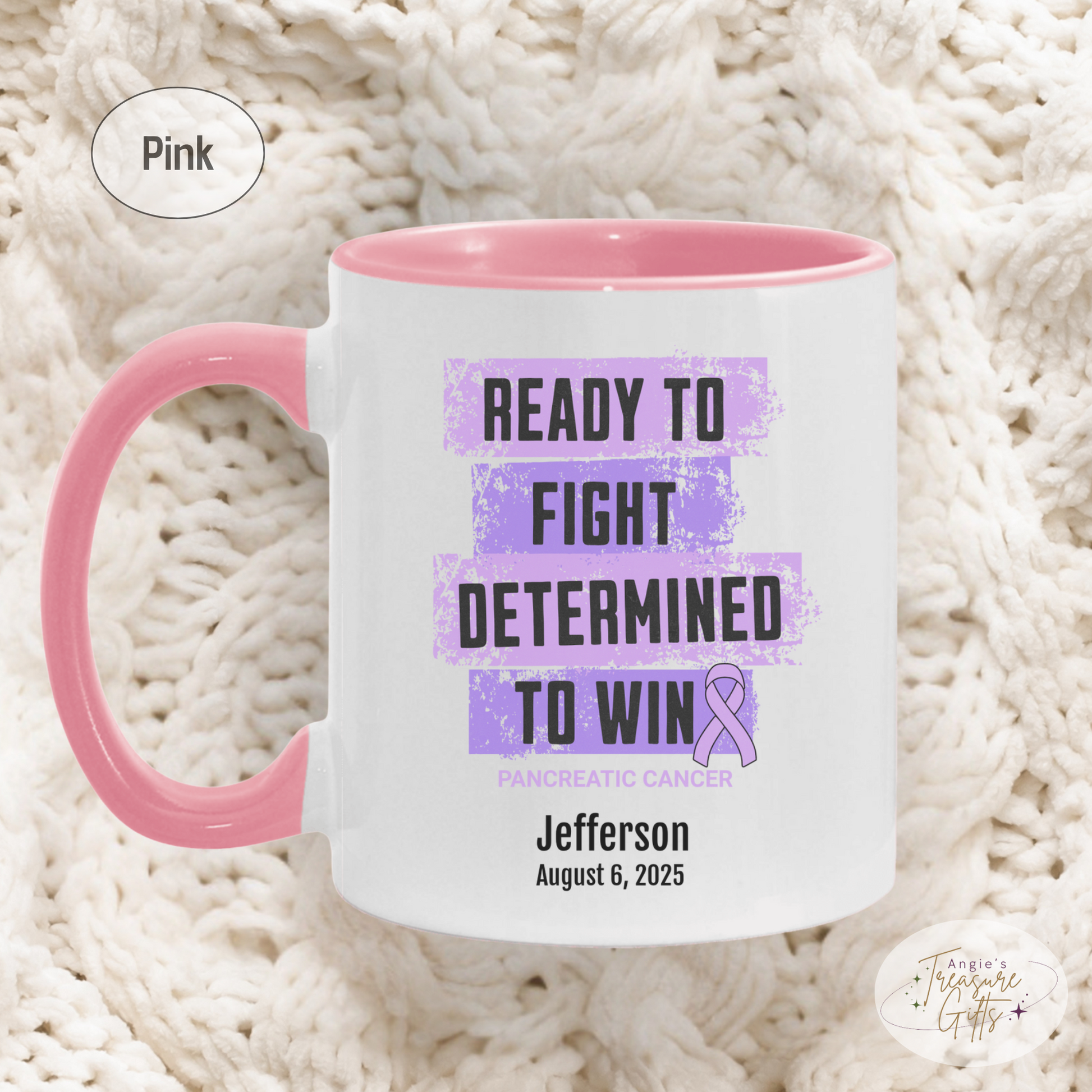 Personalized Pancreatic Cancer Awareness Mug – “Ready to Fight, Determined to Win” – Purple Ribbon Survivor Gift