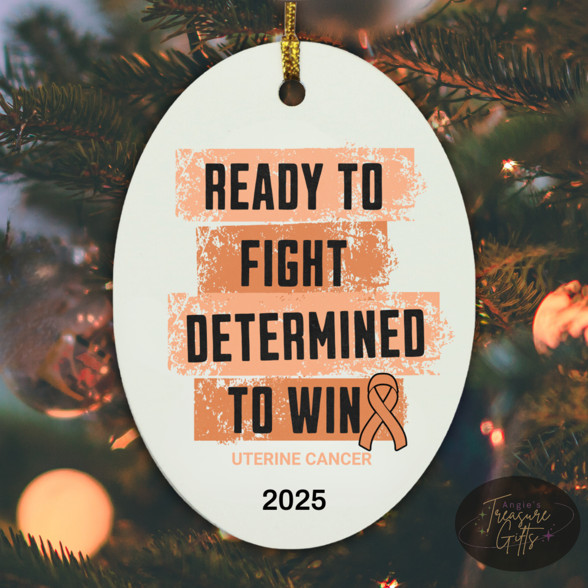 Celebrate hope with our uterine cancer awareness ornaments, featuring a peach ribbon and bold words of determination. Personalize with the year to commemorate diagnosis, remission, or survivorship.