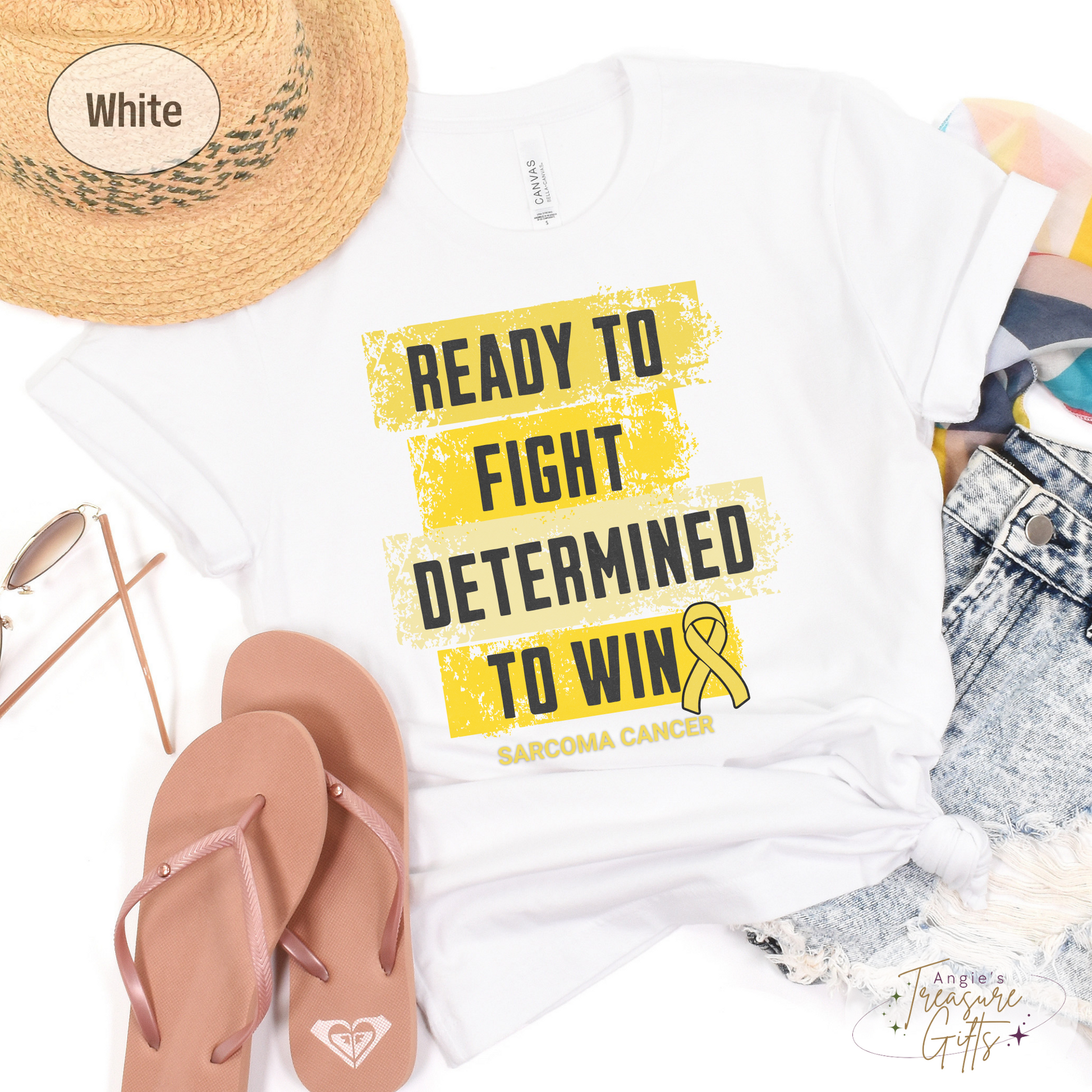 Designed with the phrase "Ready to Fight – Determined to Win" in distressed yellow color block lettering, this bold and meaningful tee represents courage, hope, and resilience. Printed on the premium Bella Canvas 3001 unisex shirt, it’s a comfortable and stylish way to support Sarcoma awareness.