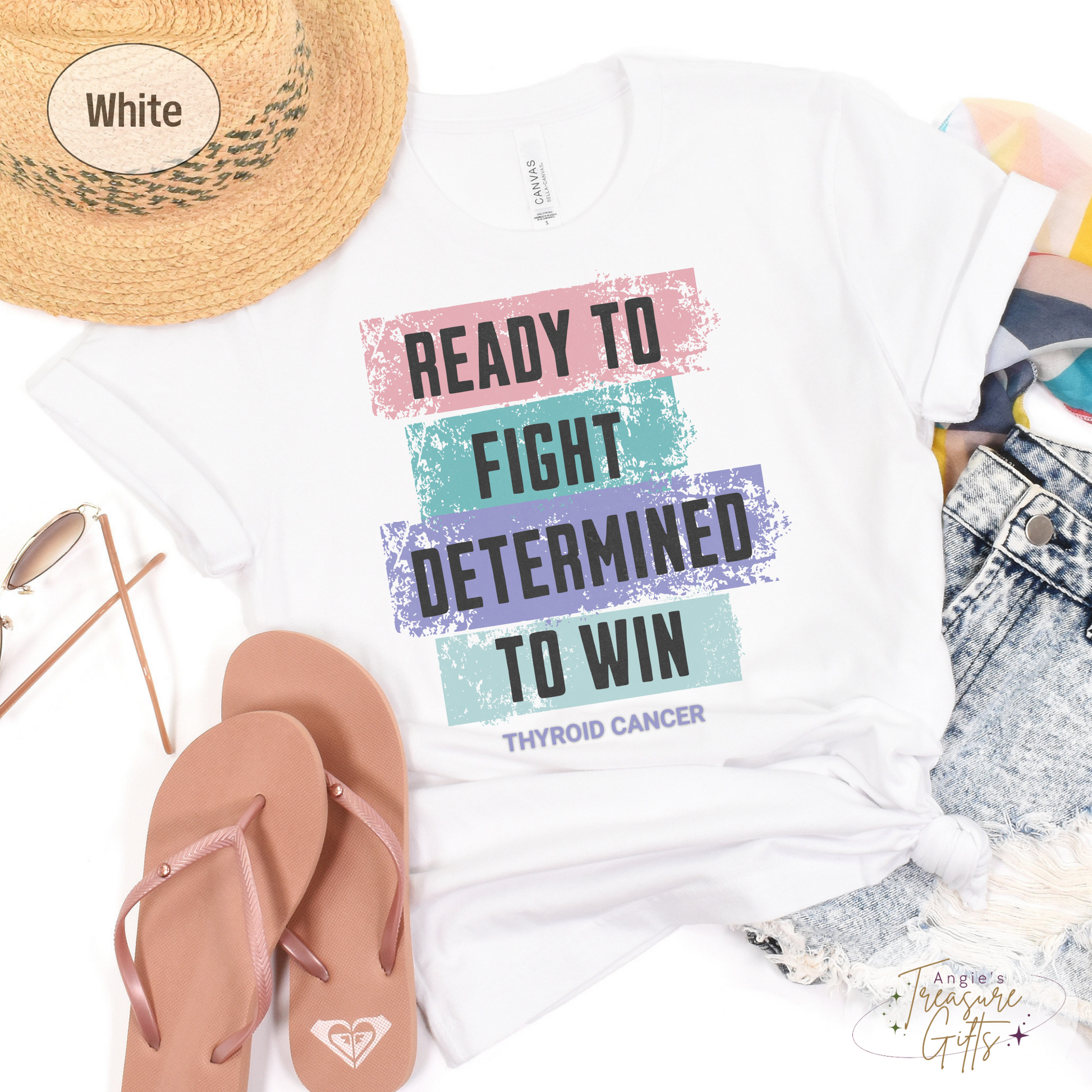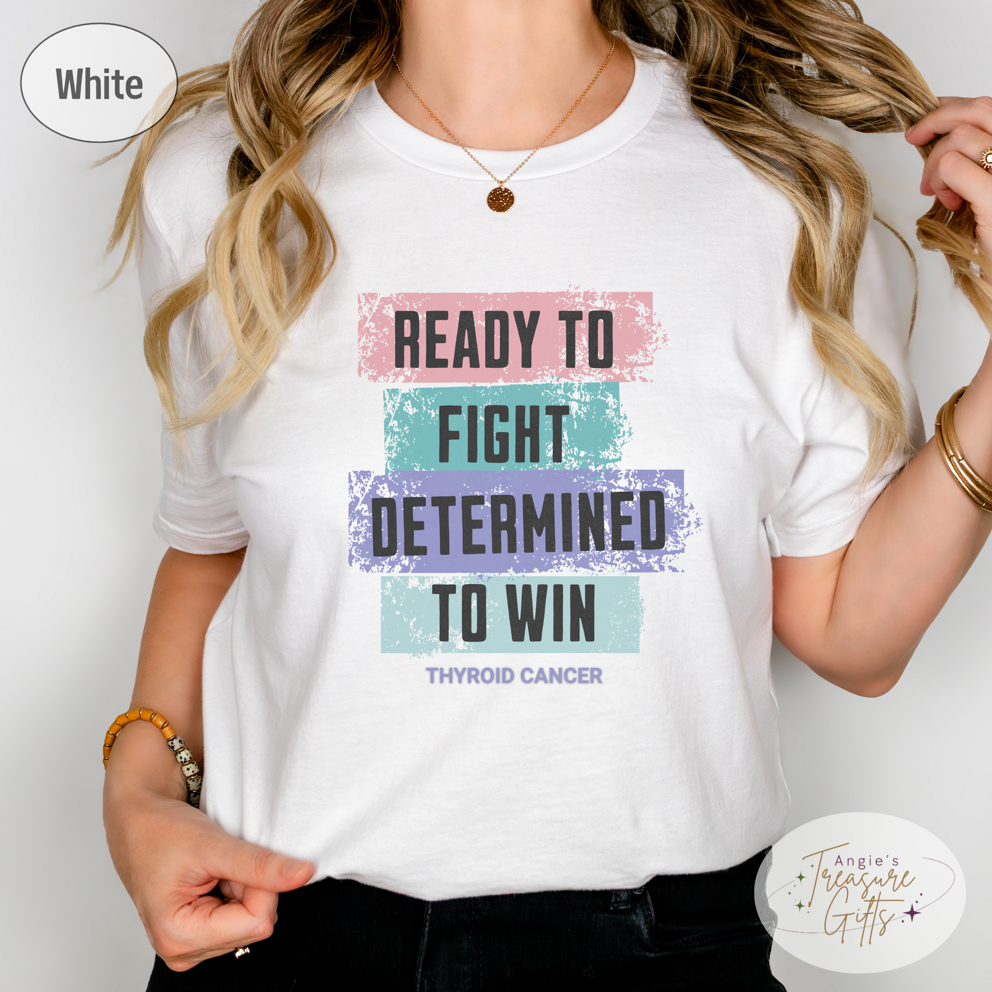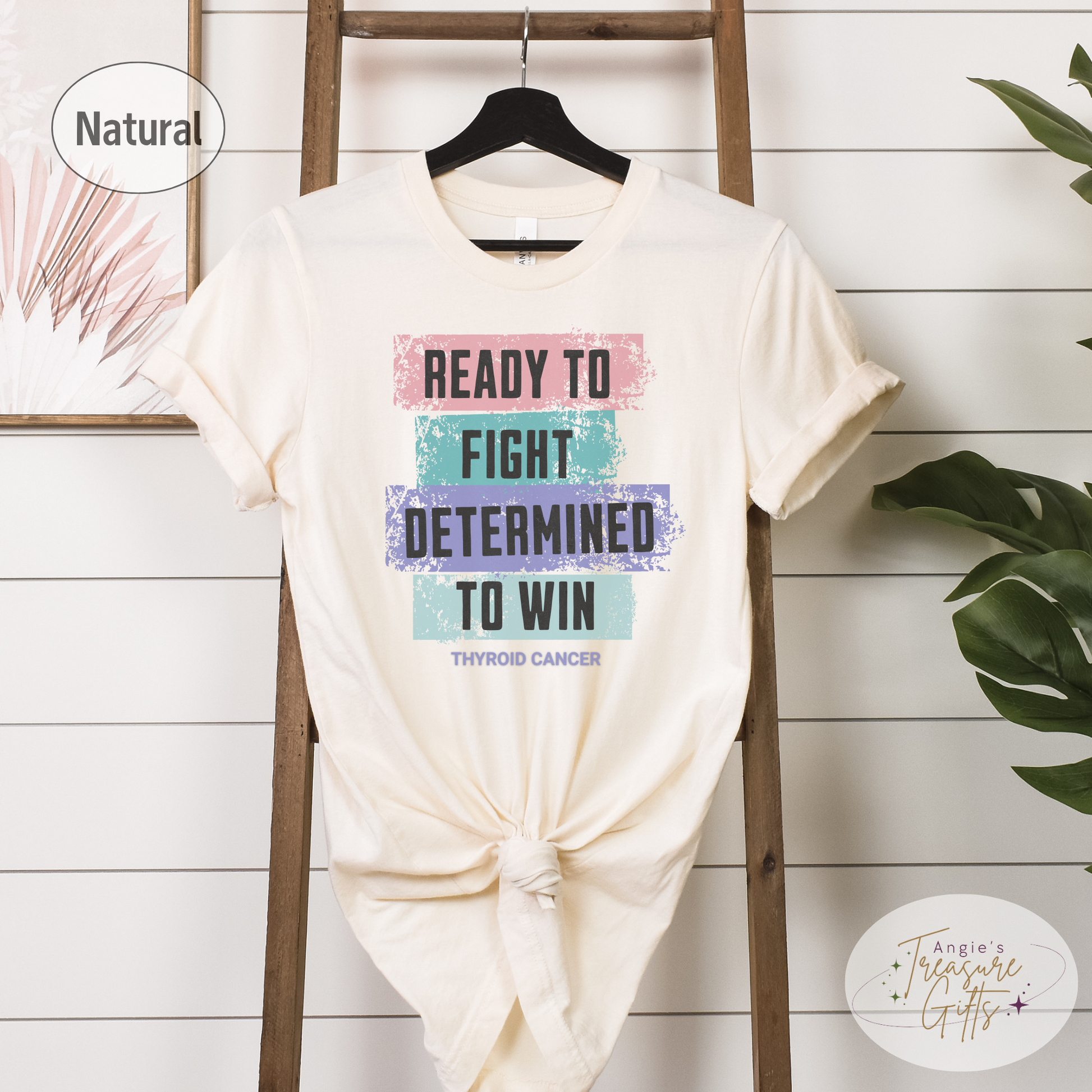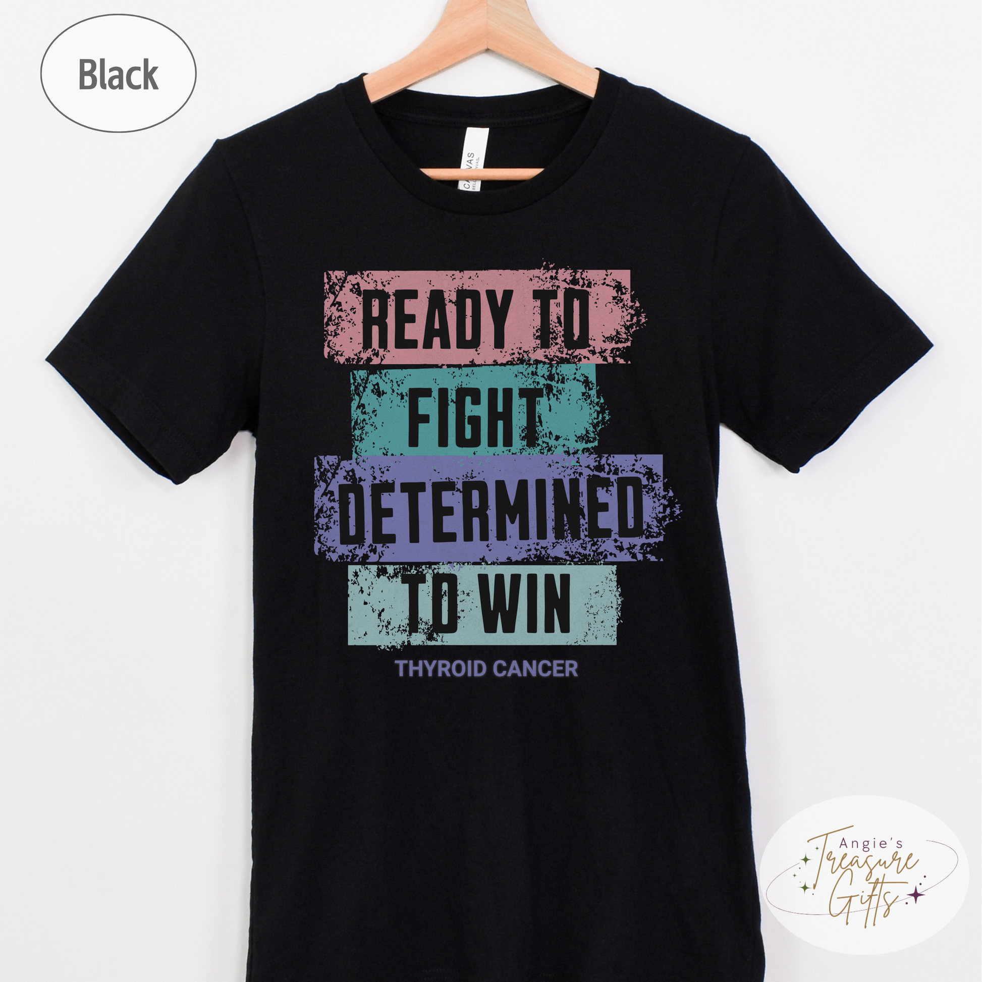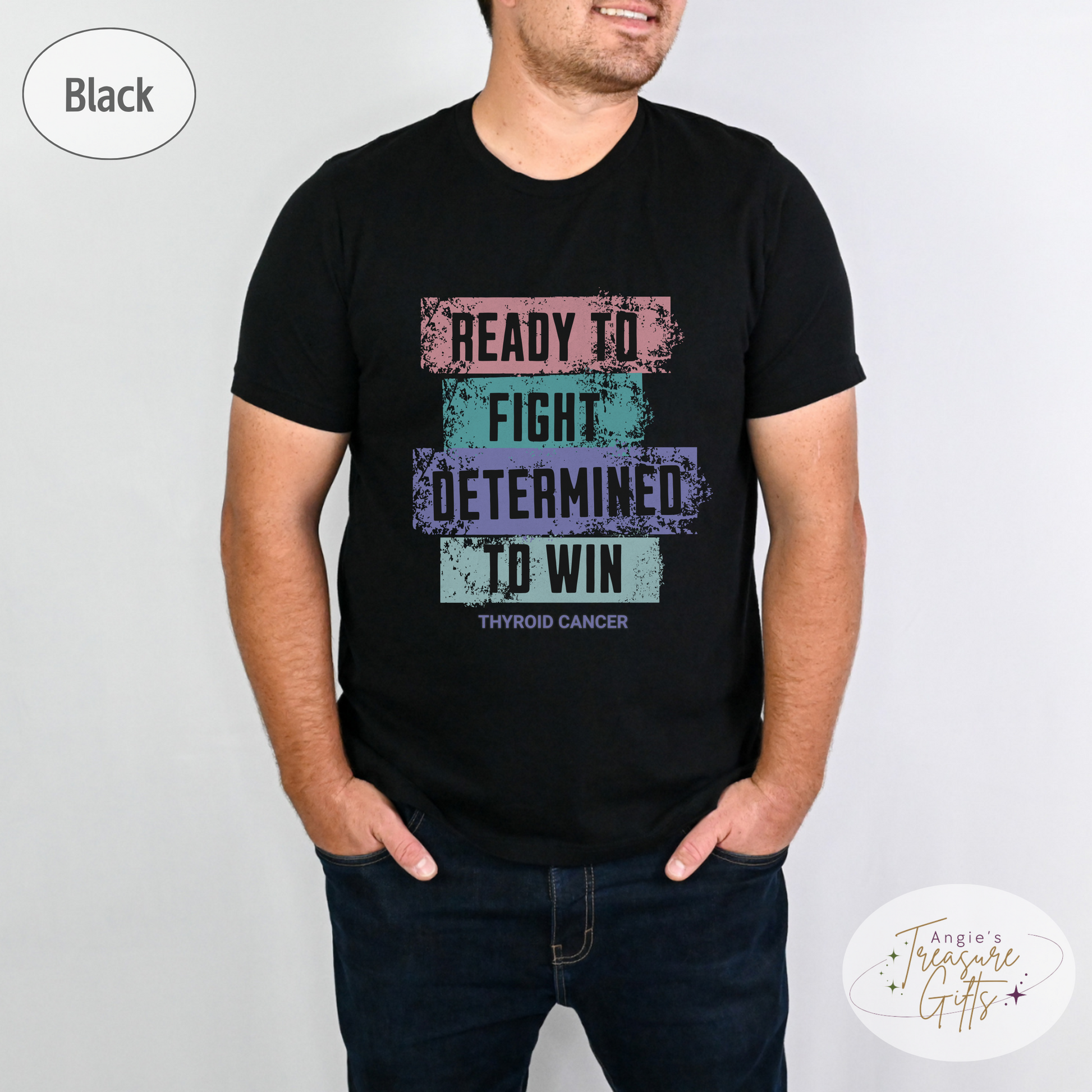 Featuring the powerful words "Ready to Fight – Determined to Win" in a unique distressed color block design using the thyroid cancer ribbon colors—pink, teal, and purple—this tee is a bold and meaningful way to support the fight. Printed on the ultra-soft Bella Canvas 3001, it’s designed for comfort, awareness, and impact.